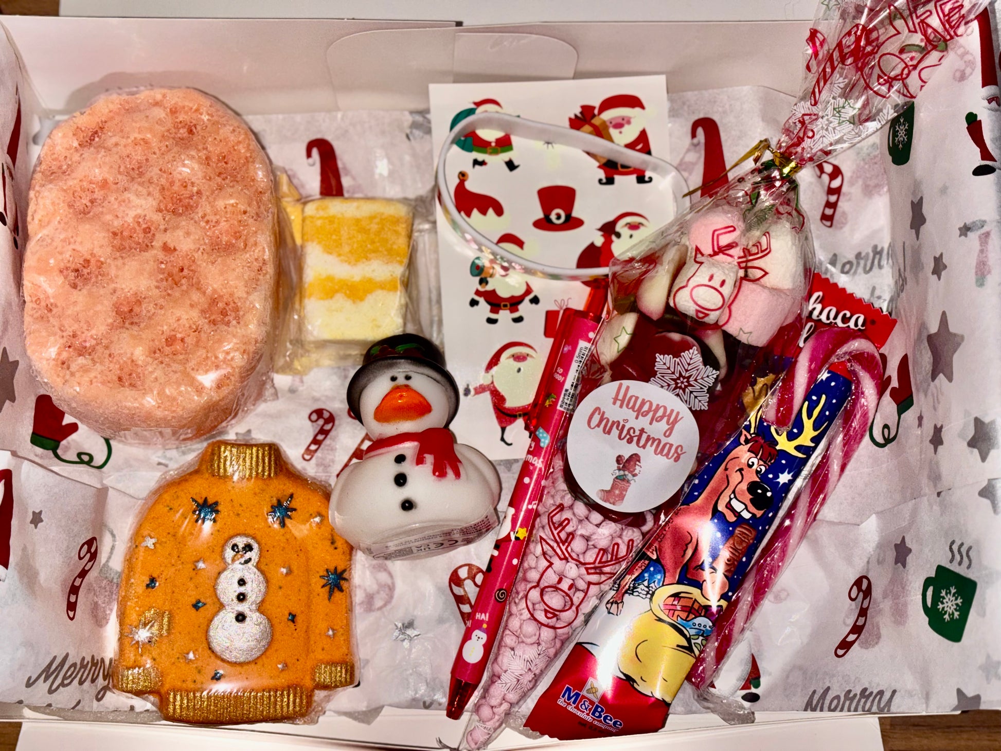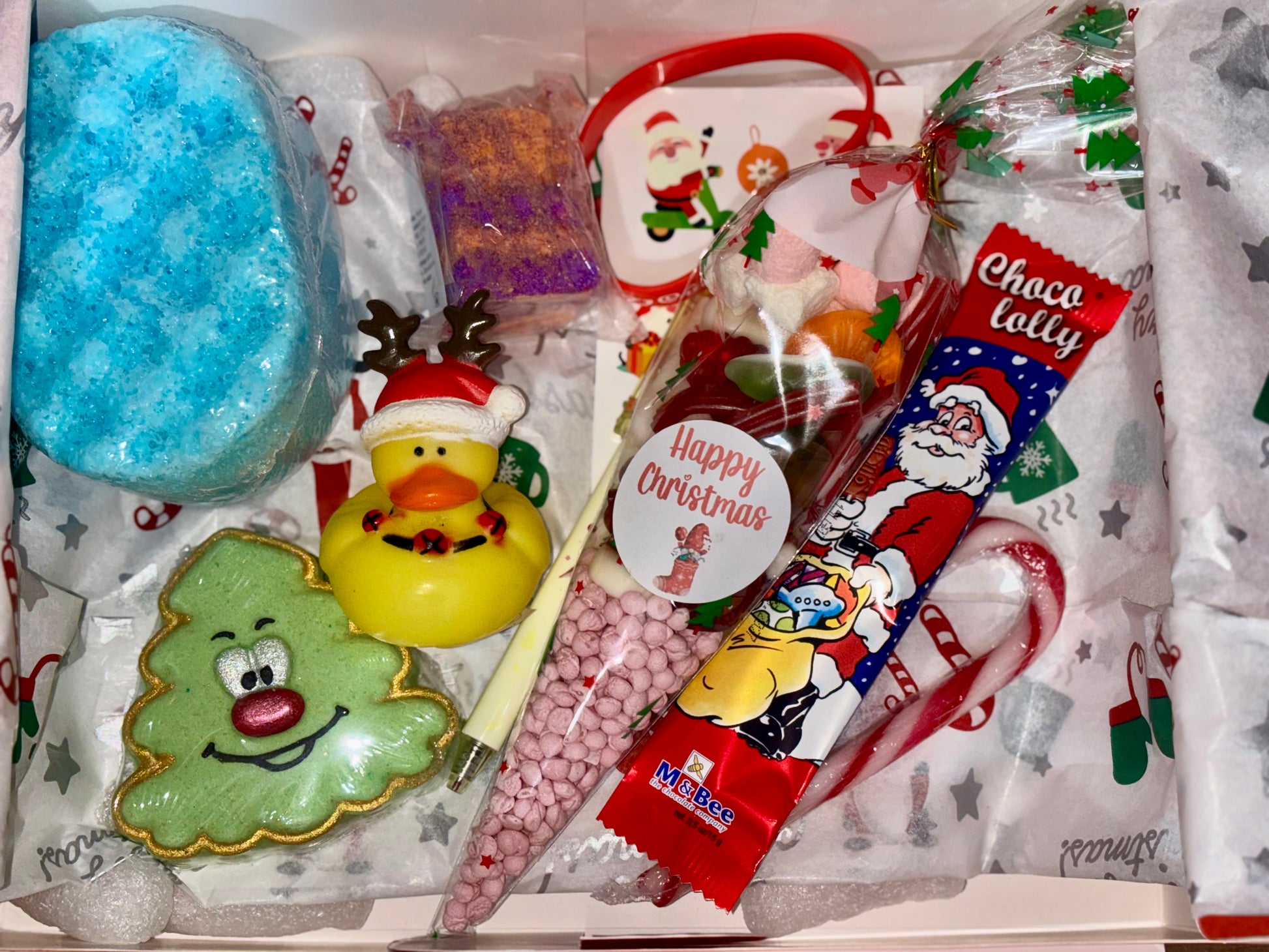 contains: small soap sponge, bath bomb, bath rock, Christmas tattoos, Christmas pen, Christmas wrist band, Christmas rubber duck, Chocolate lolly, Candy cane and a sweetie cone